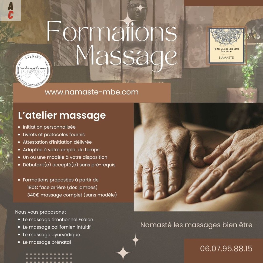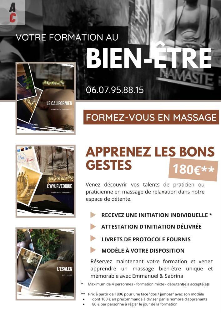 Vous souhaitez apprendre à masser ..? Excellente idée ! Le massage est une pratique ancestrale qui offre de nombreux bienfaits : relaxation, réduction du stress, soulagement des tensions musculaires... C'est un art qui se transmet et se perfectionne avec la pratique.