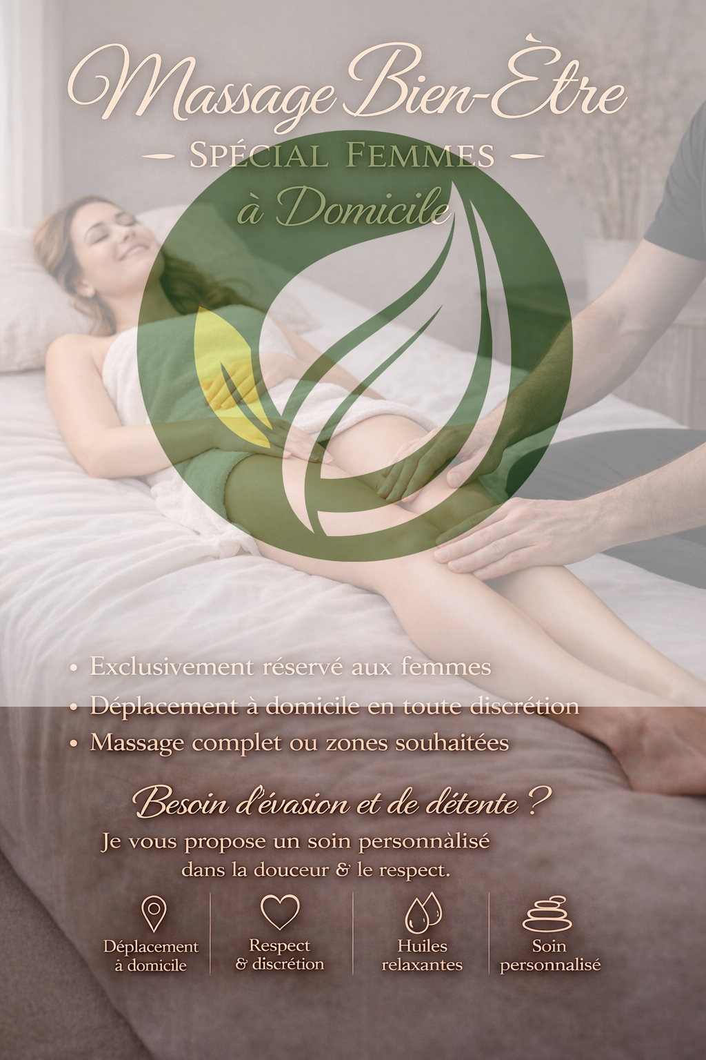 Bonjour je me déplace à domicile Je propose des séances de massage relaxant complet exclusivement réservées aux femmes. Je me déplace uniquement à votre domicile pour votre confort.
